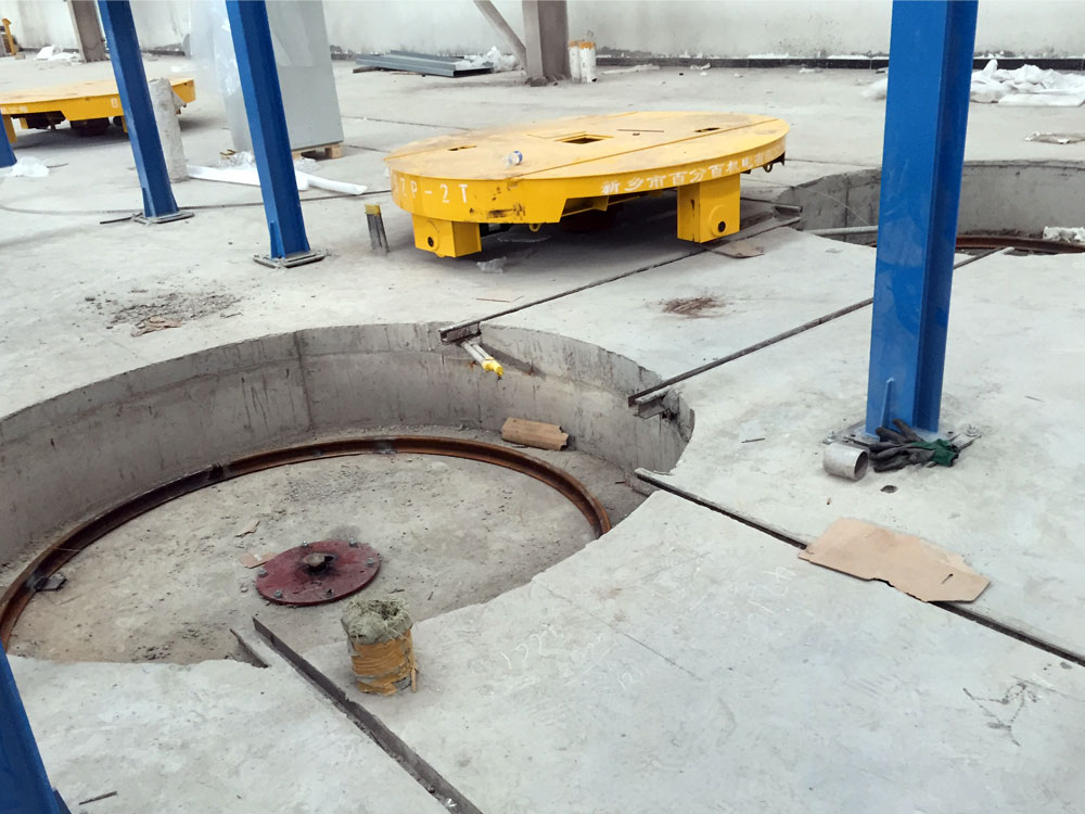 我公司生產(chǎn)的電動換軌轉(zhuǎn)盤是一種能夠在90度轉(zhuǎn)彎的軌道上運行的轉(zhuǎn)運車。它的工作原理是:轉(zhuǎn)運車運行至電動旋轉(zhuǎn)平臺上,通過手動手動或自動旋轉(zhuǎn)電動旋轉(zhuǎn)平臺,與垂直軌道對接,使轉(zhuǎn)運車可沿垂直軌道運行,實現(xiàn)90度轉(zhuǎn)彎,它非常適用于裝備生產(chǎn)線的環(huán)形軌道、交叉軌道等工作場合。通過運載車輛行駛到換軌轉(zhuǎn)盤上,軌道轉(zhuǎn)盤轉(zhuǎn)過指定角度的軌道上,來實現(xiàn)任意角度交叉軌道的換軌操作,安裝自動化定位裝置,實現(xiàn)平車平穩(wěn)的軌道對接,可通過自動化定位裝置來調(diào)整對接軌道的角度來實現(xiàn)準確對接,另外可以實現(xiàn)自動化無人控制。
