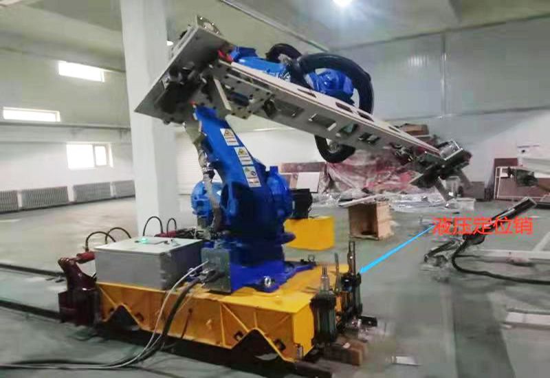 軌道小車(chē)作為搭載平臺(tái),臺(tái)車(chē)采用軌道硬導(dǎo)向,采用系統(tǒng)控制和其他設(shè)備聯(lián)動(dòng),采用伺服電機(jī)和編碼器給車(chē)輛采用精確定位,誤差精度±2mm。同時(shí)因?yàn)樽トC(jī)械臂的重心高,采用液壓夾軌器把臺(tái)車(chē)和軌道連接在一起,防止車(chē)輛的側(cè)翻。